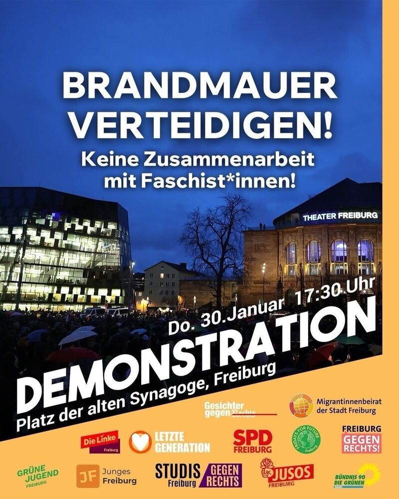 Gemeinsam mit einem breiten Bündnis demokratischer Kräfte wollen wir heute Abend ein Zeichen für unsere Demokratie und gegen den Rechtsruck setzen! Wir laden euch alle ein zur Demonstration: