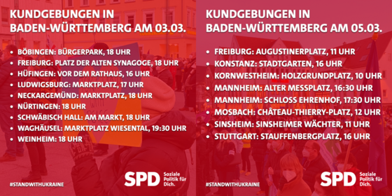 Überall im Land finden auch heute und am Wochenende wieder Mahnwachen, Kundgebungen und Menschenketten statt. Sei dabei! Gib Deiner Familie, Deinen Freund:innen, Bekannten, Nachbar:innen und Arbeitskolleg:innen Bescheid. Bitte halte wegen Corona Abstand und nimm mit Maske teil. Hier ein - nicht vollständiger - Überblick, wo du in Baden-Württemberg in den nächsten Tagen deine Solidarität mit den Menschen in der Ukraine zeigen kannst.