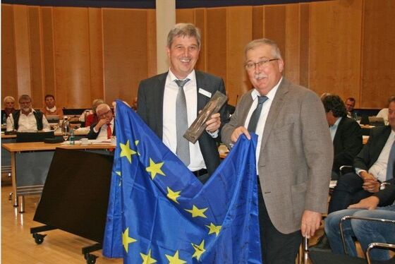 "Noch nie war eine Verabschiedung so schwierig wie heute, noch nie fand dies aufgrund einer so schweren Erkrankung statt. Wir sind alle sehr betroffen", so Landrat Stefan Bär. Er würdigte Willi Kamm als Kreisrat, der über den Tellerrand hinausgeschaut habe und den stets auch gesellschaftliche und globale Themen umgetrieben hatten - wie Europa und die Donau. Ebenso habe sich Willi Kamm, dem stets ein konstruktives Miteinander von Stadt Tuttlingen und Landkreis am Herzen lag, gerade auch maßgeblich für den Erhalt der Musikhochschule Trossingen eingesetzt. Als Abschiedsgeschenk erhielt der leidenschaftliche Europäer eine Plastik von Roland Martin und eine von allen Kreisräten und Dezernenten unterschriebene Europafahne.