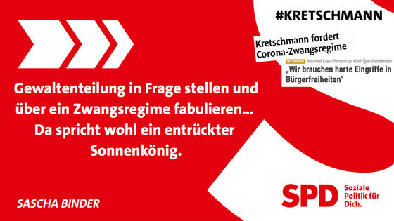 SPD-Generalsekretär Binder zeigte sich entsetzt über die Forderung von Ministerpräsident Kretschmann, man müsse die gesetzlichen Grundlagen ändern, damit die Politik in Pandemiezeiten keine Rücksicht auf den Rechtsgrundsatz der Verhältnismäßigkeit nehmen müsse: „Gewaltenteilung in Frage stellen, Freiheitsrechte unverhältnismäßig einschränken wollen und über ein Zwangsregime fabulieren… Da spricht wohl ein entrückter Sonnenkönig, der volkommen die Bodenhaftung verloren hat.“