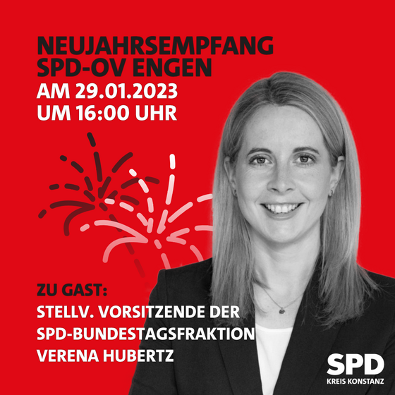 Über dieses Thema möchten wir sprechen: Wir freuen uns, im Namen von SPD-Kreisverband und SPD-Ortsverein Engen zu unserem traditionellen Neujahrsempfang im Hegau einzuladen. Zu Gast ist Verena Hubertz MdB, stv. Vorsitzende der SPD-Bundestagsfraktion, welche die Festrede im Foyer der Stadthalle Engen halten wird. Verena wird gerade über den sozial-ökologischen Transformationsprozess sprechen, in dem sich unser Land befindet, und die damit verbundenen Herausforderungen für unsere Region.