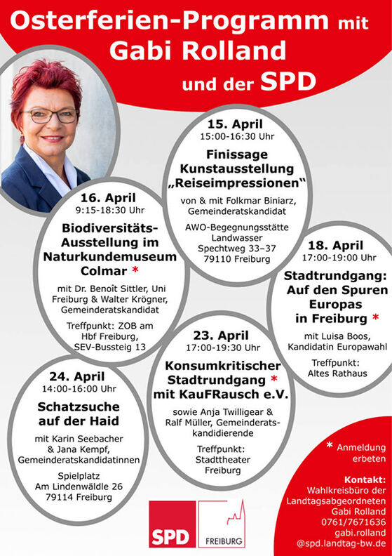 Unsere Landtagsabgeordnete Gabi Rolland hat gemeinsam mit der SPD Freiburg ein spannendes Programm für die Osterferien zusammengestellt. Besuchen Sie zusammen mit unterschiedlichen Kandidatinnen und Kandidaten für den Gemeinderat Veranstaltungen wie die Biodiversitäts-Ausstellung im Naturkundemuseum Colmar oder lassen Sie sich von Luisa Boos Freiburg von der europäischen Perspektive zeigen.