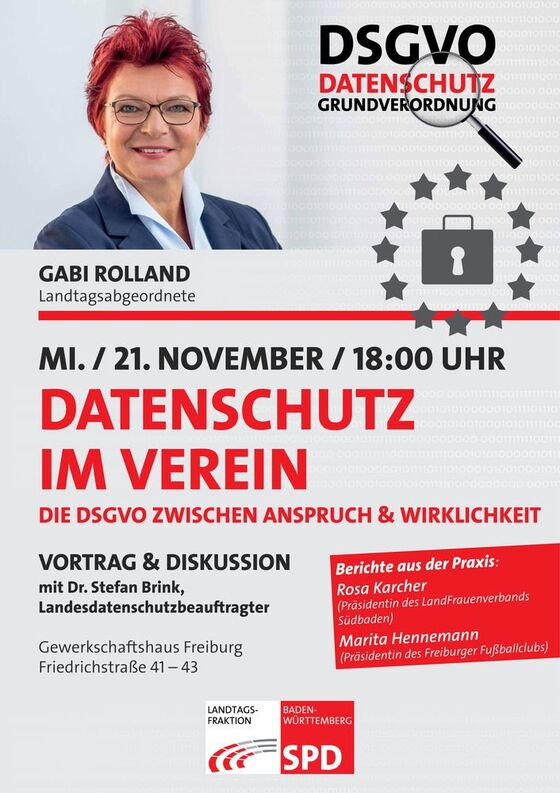 Um diese Unsicherheiten zu beseitigen und datenschutzrechtliche Fragen zu klären, habe ich Baden-Württembergs Experten in Sachen Datenschutz nach Freiburg eingeladen: Bei einer Informations- und Diskussionsveranstaltung wird Dr. Stefan Brink, Datenschutzbeauftragter des Landes Baden-Württemberg, die wesentlichen gesetzlichen Anforderungen zum Datenschutz im Verein (Informations- und Dokumentationspflichten, Erstellung eines Verzeichnis der Verarbeitungstätigkeiten, Umgang mit Fotos/Videos, etc.) vorstellen und Fragen aus dem Publikum beantworten.