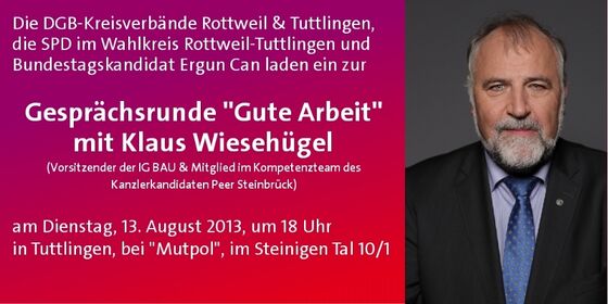 „Gute Arbeit“ lautete nicht nur das Motto der Veranstaltung, zu der der DGB Rottweil- Tuttlingen und die SPD mit Bundestagskandidat Ergun Can am Dienstagabend gemeinsam nach Tuttlingen ins Foyer von „Mutpol“ eingeladen hatten. „Gute Arbeit“ ist gerade im Vorfeld der Bundestagswahl die zentrale Forderung der Sozialdemokratie und der Gewerkschaften. Dies unterstrich Klaus Wiesehügel als Gast des Abends. Der Vorsitzende der Gewerkschaft IG BAU ist Mitglied des Kompetenzteams von Kanzlerkandidat Peer Steinbrück und könnte bei einem Regierungswechsel Bundesarbeitsminister werden